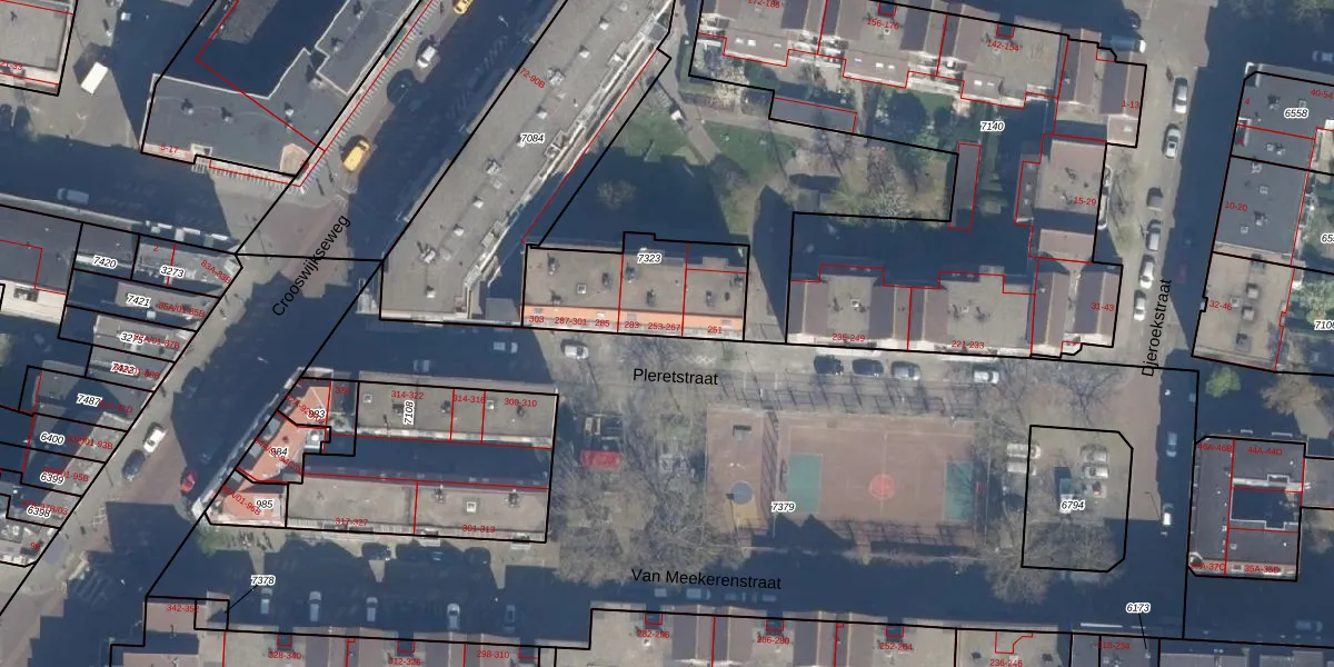Pleretstraat 267 is gelegen op kadastraal perceel RTD07R7323. Deze kadastrale aanduiding is uniek en wordt gebruikt door het Kadaster om eigendomsrechten en andere zakelijke rechten vast te leggen. Het perceel maakt onderdeel uit van de kadastrale gemeente Rotterdam.