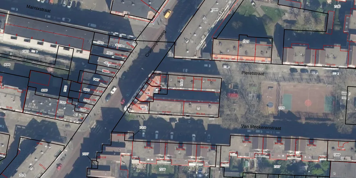 Pleretstraat 320 is gelegen op kadastraal perceel RTD07R7108. Deze kadastrale aanduiding is uniek en wordt gebruikt door het Kadaster om eigendomsrechten en andere zakelijke rechten vast te leggen. Het perceel maakt onderdeel uit van de kadastrale gemeente Rotterdam.