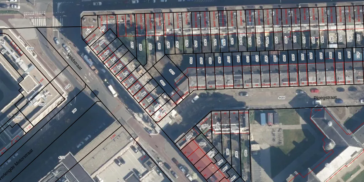 Ploegstraat 65 is gelegen op kadastraal perceel CLS00F3023. Deze kadastrale aanduiding is uniek en wordt gebruikt door het Kadaster om eigendomsrechten en andere zakelijke rechten vast te leggen. Het perceel maakt onderdeel uit van de kadastrale gemeente Charlois.