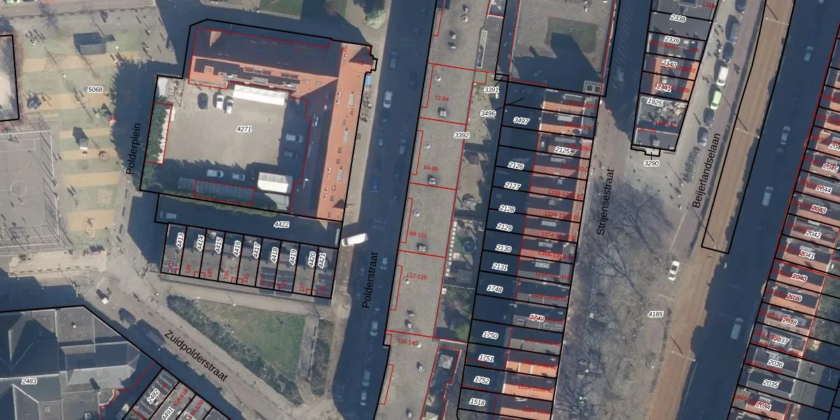 Polderstraat 102 is gelegen op kadastraal perceel CLS00F3392. Deze kadastrale aanduiding is uniek en wordt gebruikt door het Kadaster om eigendomsrechten en andere zakelijke rechten vast te leggen. Het perceel maakt onderdeel uit van de kadastrale gemeente Charlois.