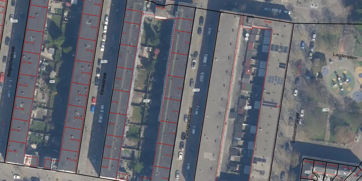 Het perceel waarop Portugesestraat 9 staat heeft een oppervlakte van 3846 m². Dit is een zeer groot perceel. De perceeloppervlakte wordt geregistreerd door het Kadaster. Gedetailleerde informatie over de maten van dit perceel kunt u vinden in het rapport Kadastrale kaart met maatvoering van Portugesestraat 9.