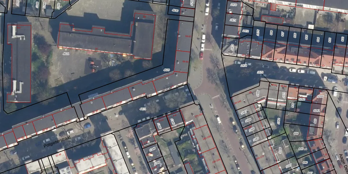 Potgieterstraat 5 is gelegen op kadastraal perceel RTD10Z4629. Deze kadastrale aanduiding is uniek en wordt gebruikt door het Kadaster om eigendomsrechten en andere zakelijke rechten vast te leggen. Het perceel maakt onderdeel uit van de kadastrale gemeente Rotterdam.