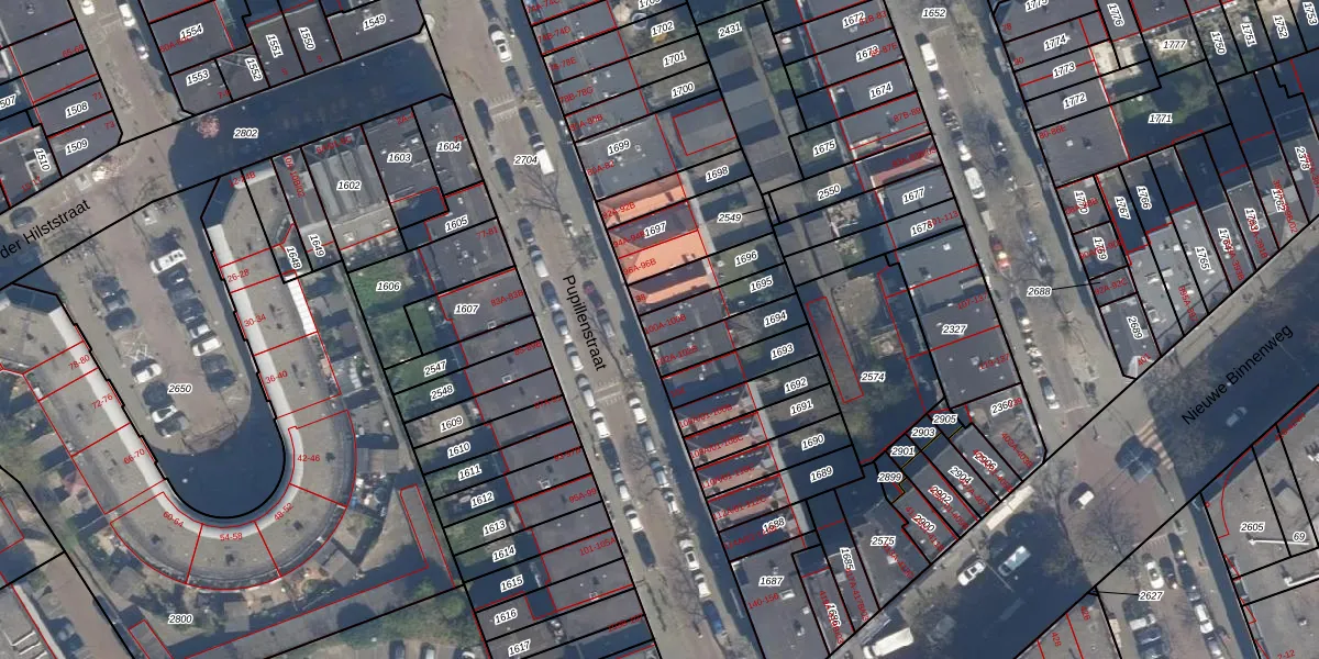 Pupillenstraat 100-B is gelegen op kadastraal perceel DHV00F1695. Deze kadastrale aanduiding is uniek en wordt gebruikt door het Kadaster om eigendomsrechten en andere zakelijke rechten vast te leggen. Het perceel maakt onderdeel uit van de kadastrale gemeente Delfshaven.
