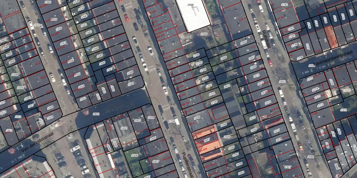 Pupillenstraat 74-B is gelegen op kadastraal perceel DHV00F1703. Deze kadastrale aanduiding is uniek en wordt gebruikt door het Kadaster om eigendomsrechten en andere zakelijke rechten vast te leggen. Het perceel maakt onderdeel uit van de kadastrale gemeente Delfshaven.