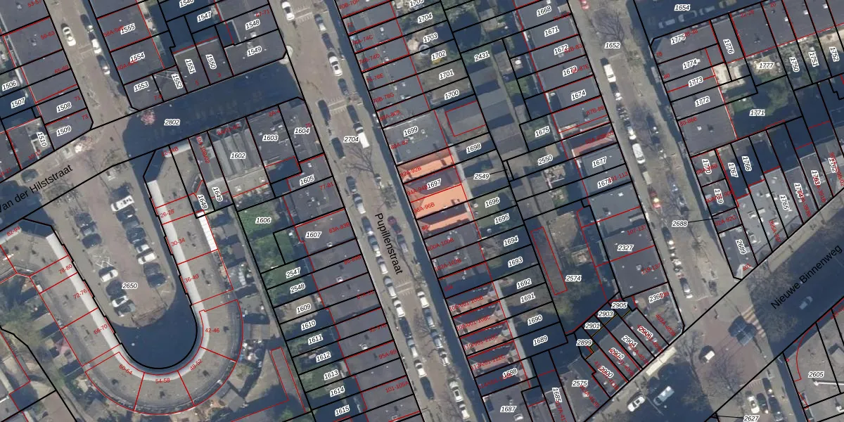 Pupillenstraat 96-B is gelegen op kadastraal perceel DHV00F1697. Deze kadastrale aanduiding is uniek en wordt gebruikt door het Kadaster om eigendomsrechten en andere zakelijke rechten vast te leggen. Het perceel maakt onderdeel uit van de kadastrale gemeente Delfshaven.