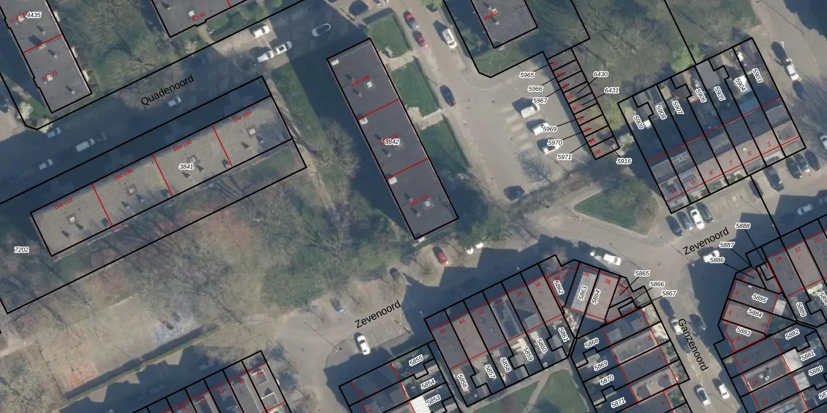 Het perceel waarop Quadenoord 114 staat heeft een oppervlakte van 564 m². Dit is een groot perceel. De perceeloppervlakte wordt geregistreerd door het Kadaster. Gedetailleerde informatie over de maten van dit perceel kunt u vinden in het rapport Kadastrale kaart met maatvoering van Quadenoord 114.