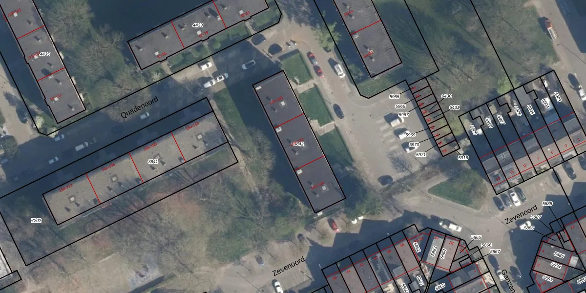 Het perceel waarop Quadenoord 128 staat heeft een oppervlakte van 564 m². Dit is een groot perceel. De perceeloppervlakte wordt geregistreerd door het Kadaster. Gedetailleerde informatie over de maten van dit perceel kunt u vinden in het rapport Kadastrale kaart met maatvoering van Quadenoord 128.