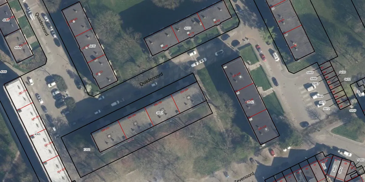Het perceel waarop Quadenoord 160 staat heeft een oppervlakte van 755 m². Dit is een groot perceel. De perceeloppervlakte wordt geregistreerd door het Kadaster. Gedetailleerde informatie over de maten van dit perceel kunt u vinden in het rapport Kadastrale kaart met maatvoering van Quadenoord 160.