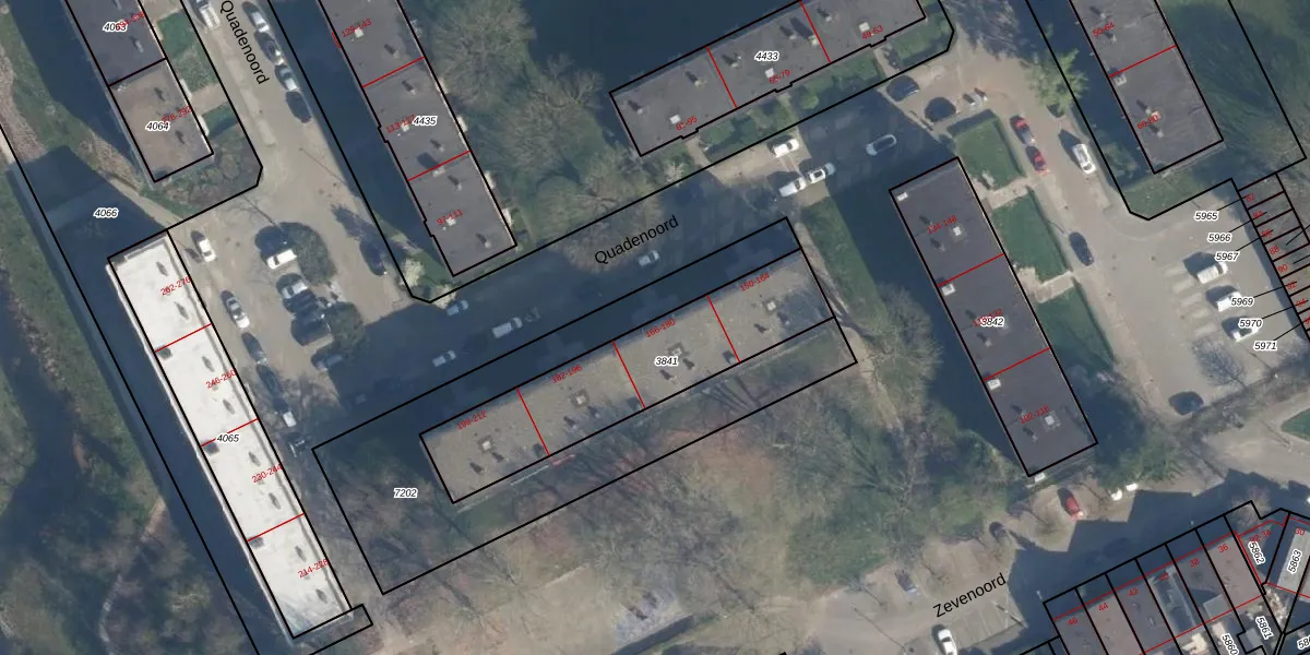 Het perceel waarop Quadenoord 174 staat heeft een oppervlakte van 755 m². Dit is een groot perceel. De perceeloppervlakte wordt geregistreerd door het Kadaster. Gedetailleerde informatie over de maten van dit perceel kunt u vinden in het rapport Kadastrale kaart met maatvoering van Quadenoord 174.