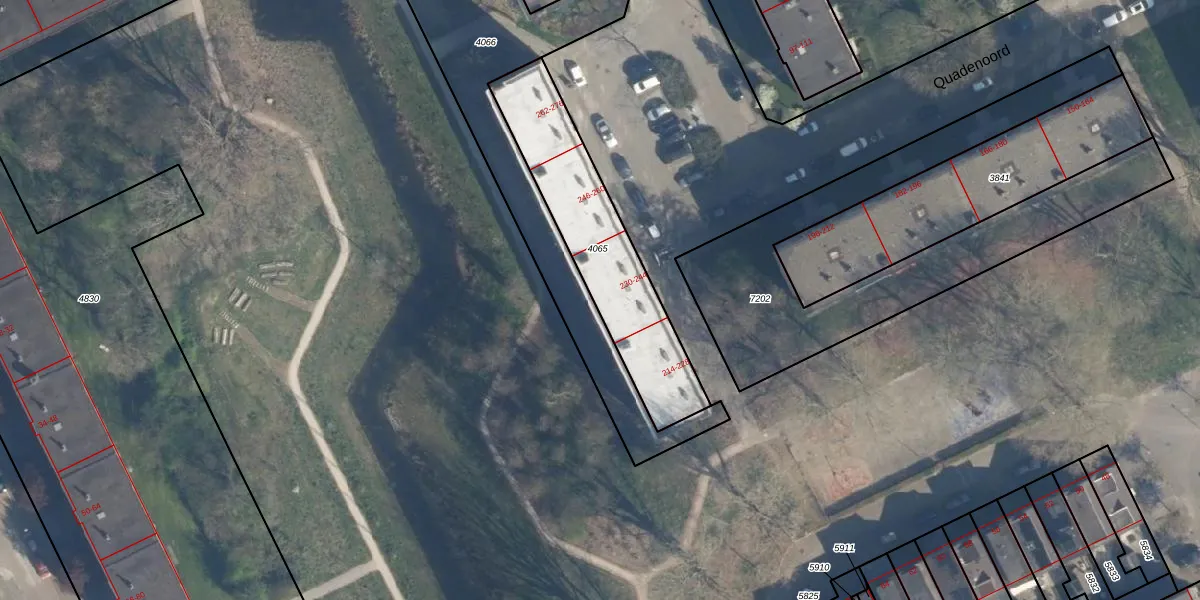 Het perceel waarop Quadenoord 238 staat heeft een oppervlakte van 632 m². Dit is een groot perceel. De perceeloppervlakte wordt geregistreerd door het Kadaster. Gedetailleerde informatie over de maten van dit perceel kunt u vinden in het rapport Kadastrale kaart met maatvoering van Quadenoord 238.