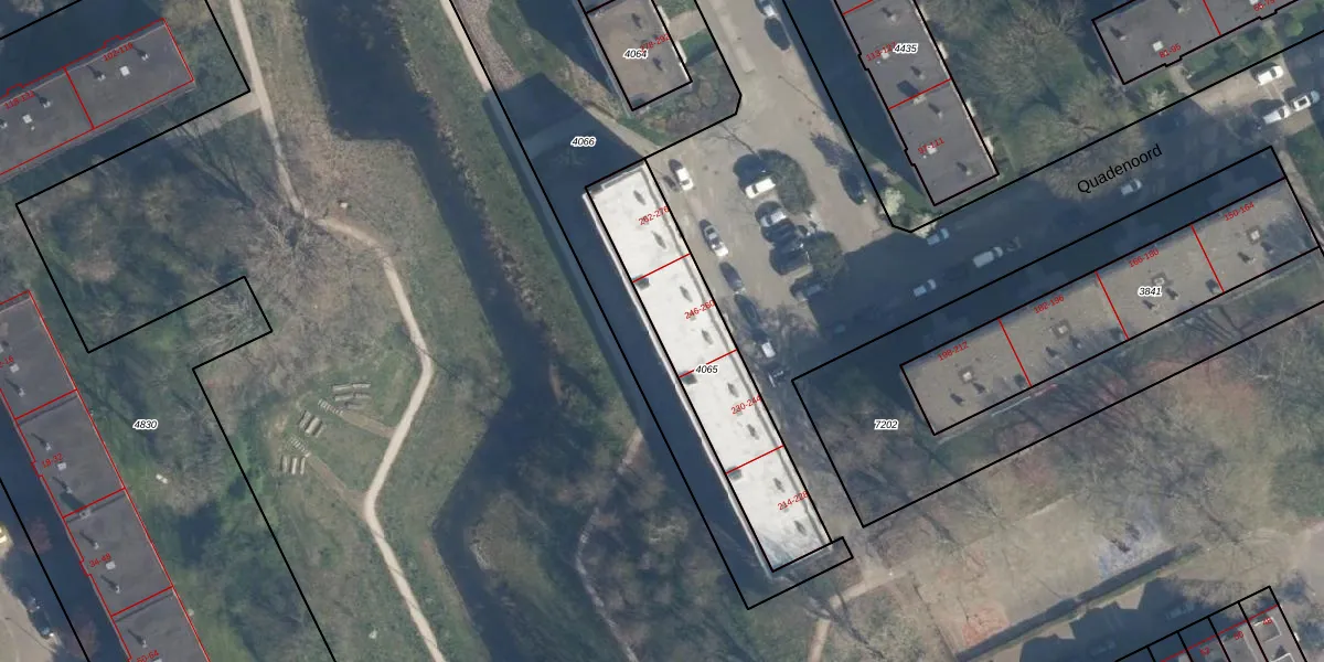 Het perceel waarop Quadenoord 256 staat heeft een oppervlakte van 632 m². Dit is een groot perceel. De perceeloppervlakte wordt geregistreerd door het Kadaster. Gedetailleerde informatie over de maten van dit perceel kunt u vinden in het rapport Kadastrale kaart met maatvoering van Quadenoord 256.