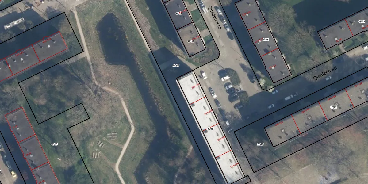 Het perceel waarop Quadenoord 270 staat heeft een oppervlakte van 632 m². Dit is een groot perceel. De perceeloppervlakte wordt geregistreerd door het Kadaster. Gedetailleerde informatie over de maten van dit perceel kunt u vinden in het rapport Kadastrale kaart met maatvoering van Quadenoord 270.