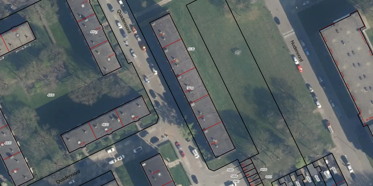 Het perceel waarop Quadenoord 38 staat heeft een oppervlakte van 943 m². Dit is een groot perceel. De perceeloppervlakte wordt geregistreerd door het Kadaster. Gedetailleerde informatie over de maten van dit perceel kunt u vinden in het rapport Kadastrale kaart met maatvoering van Quadenoord 38.