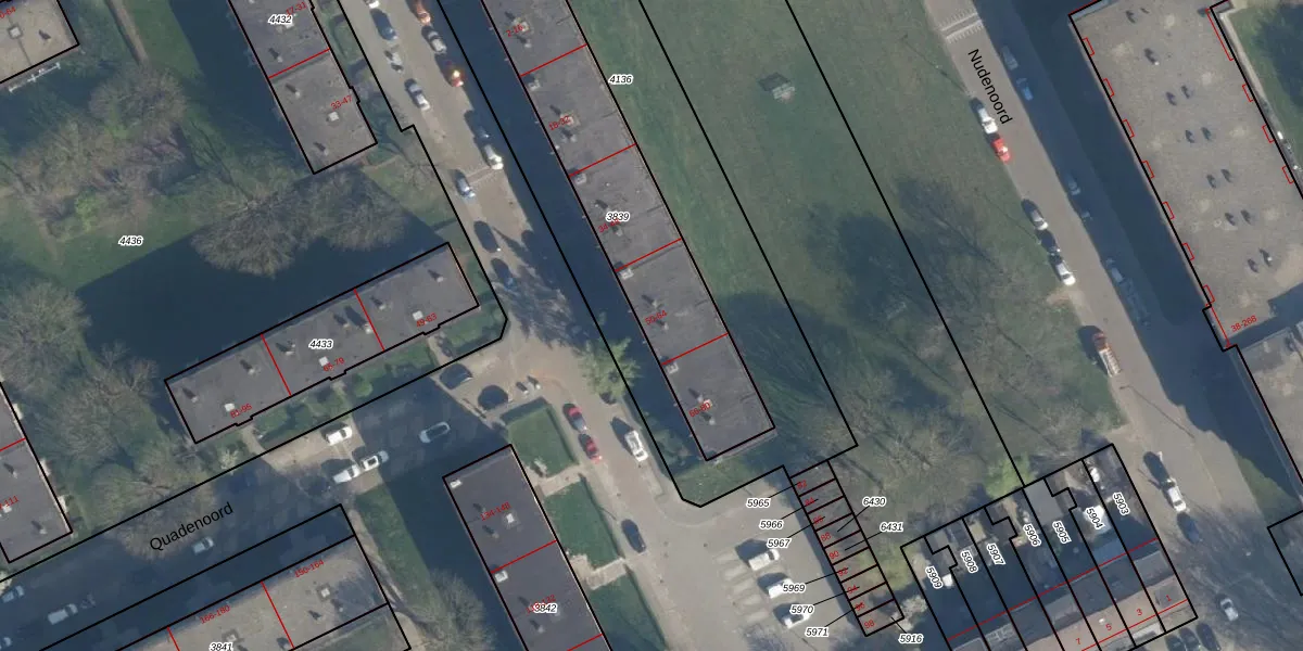 Het perceel waarop Quadenoord 56 staat heeft een oppervlakte van 943 m². Dit is een groot perceel. De perceeloppervlakte wordt geregistreerd door het Kadaster. Gedetailleerde informatie over de maten van dit perceel kunt u vinden in het rapport Kadastrale kaart met maatvoering van Quadenoord 56.