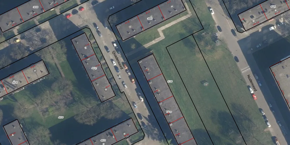 Het perceel waarop Quadenoord 6 staat heeft een oppervlakte van 943 m². Dit is een groot perceel. De perceeloppervlakte wordt geregistreerd door het Kadaster. Gedetailleerde informatie over de maten van dit perceel kunt u vinden in het rapport Kadastrale kaart met maatvoering van Quadenoord 6.