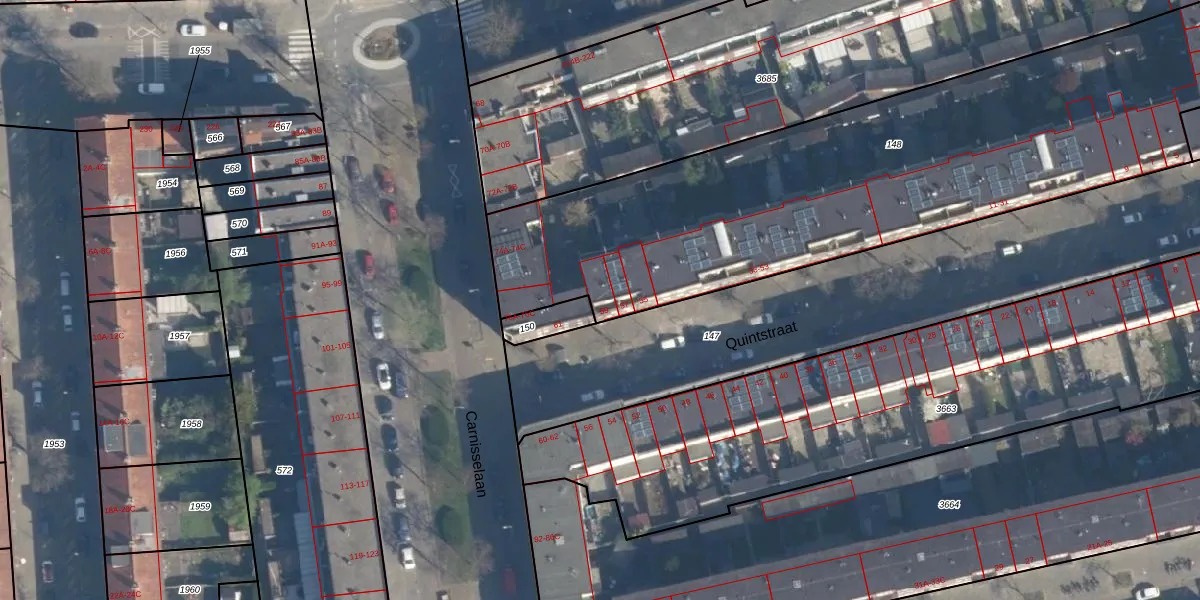 Het perceel waarop Quintstraat 59 staat heeft een oppervlakte van 2852 m². Dit is een zeer groot perceel. De perceeloppervlakte wordt geregistreerd door het Kadaster. Gedetailleerde informatie over de maten van dit perceel kunt u vinden in het rapport Kadastrale kaart met maatvoering van Quintstraat 59.