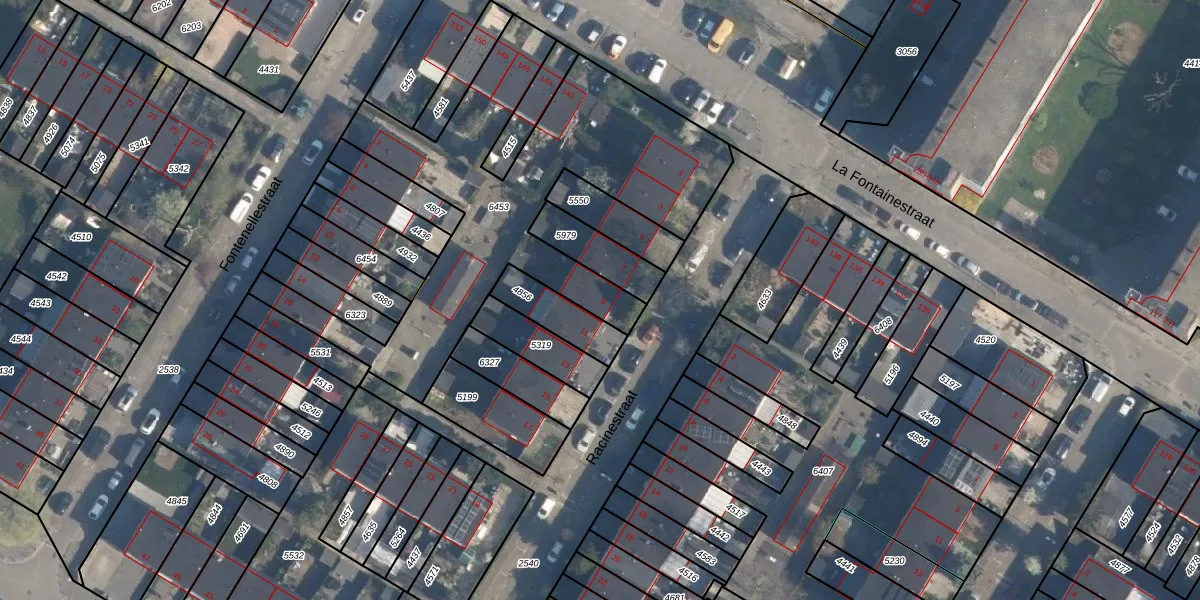 Het perceel waarop Racinestraat 9 staat heeft een oppervlakte van 1659 m². Dit is een zeer groot perceel. De perceeloppervlakte wordt geregistreerd door het Kadaster. Gedetailleerde informatie over de maten van dit perceel kunt u vinden in het rapport Kadastrale kaart met maatvoering van Racinestraat 9.