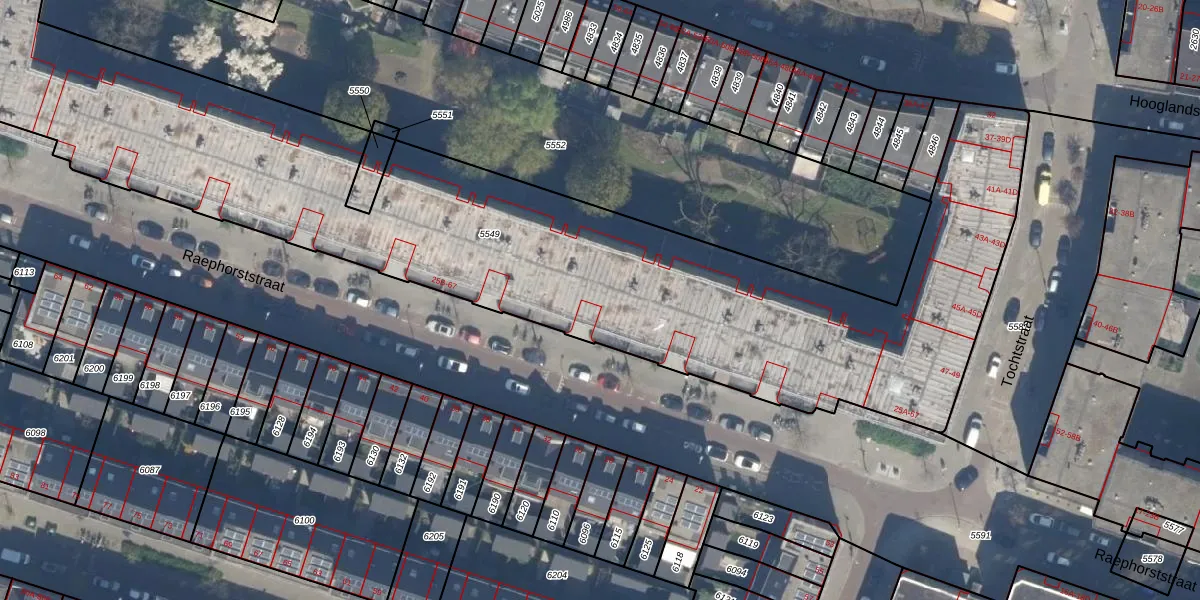Raephorststraat 45-C is gelegen op kadastraal perceel RTD07W5549. Deze kadastrale aanduiding is uniek en wordt gebruikt door het Kadaster om eigendomsrechten en andere zakelijke rechten vast te leggen. Het perceel maakt onderdeel uit van de kadastrale gemeente Rotterdam.