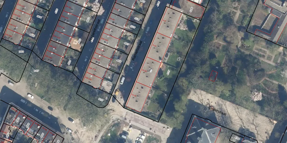 Het perceel waarop Ramlehstraat 15 staat heeft een oppervlakte van 1994 m². Dit is een zeer groot perceel. De perceeloppervlakte wordt geregistreerd door het Kadaster. Gedetailleerde informatie over de maten van dit perceel kunt u vinden in het rapport Kadastrale kaart met maatvoering van Ramlehstraat 15.
