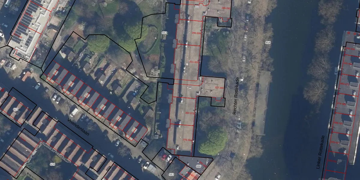 Rechter Rottekade 335 is gelegen op kadastraal perceel RTD08AD663. Deze kadastrale aanduiding is uniek en wordt gebruikt door het Kadaster om eigendomsrechten en andere zakelijke rechten vast te leggen. Het perceel maakt onderdeel uit van de kadastrale gemeente Rotterdam.