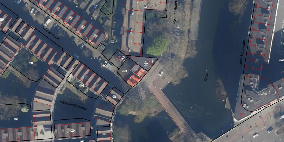 Rechter Rottekade 405 is gelegen op kadastraal perceel RTD08AD553. Deze kadastrale aanduiding is uniek en wordt gebruikt door het Kadaster om eigendomsrechten en andere zakelijke rechten vast te leggen. Het perceel maakt onderdeel uit van de kadastrale gemeente Rotterdam.