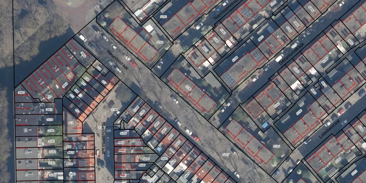Resedastraat 26-B is gelegen op kadastraal perceel CLS00G5190. Deze kadastrale aanduiding is uniek en wordt gebruikt door het Kadaster om eigendomsrechten en andere zakelijke rechten vast te leggen. Het perceel maakt onderdeel uit van de kadastrale gemeente Charlois.