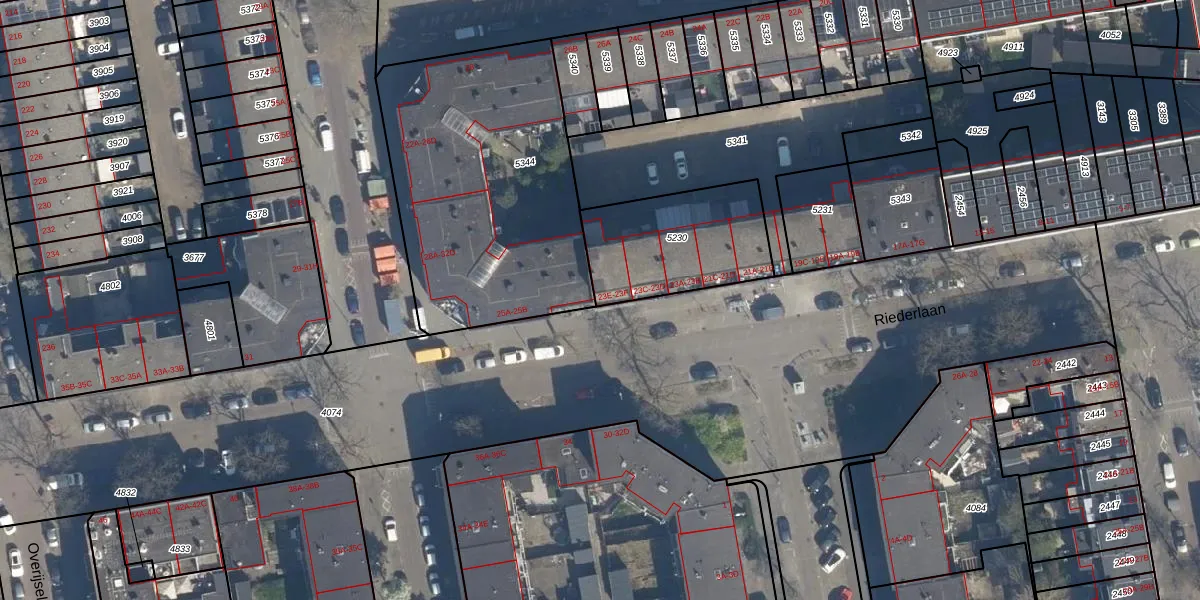 Riederlaan 23-F is gelegen op kadastraal perceel RTD05V5230. Deze kadastrale aanduiding is uniek en wordt gebruikt door het Kadaster om eigendomsrechten en andere zakelijke rechten vast te leggen. Het perceel maakt onderdeel uit van de kadastrale gemeente Rotterdam.