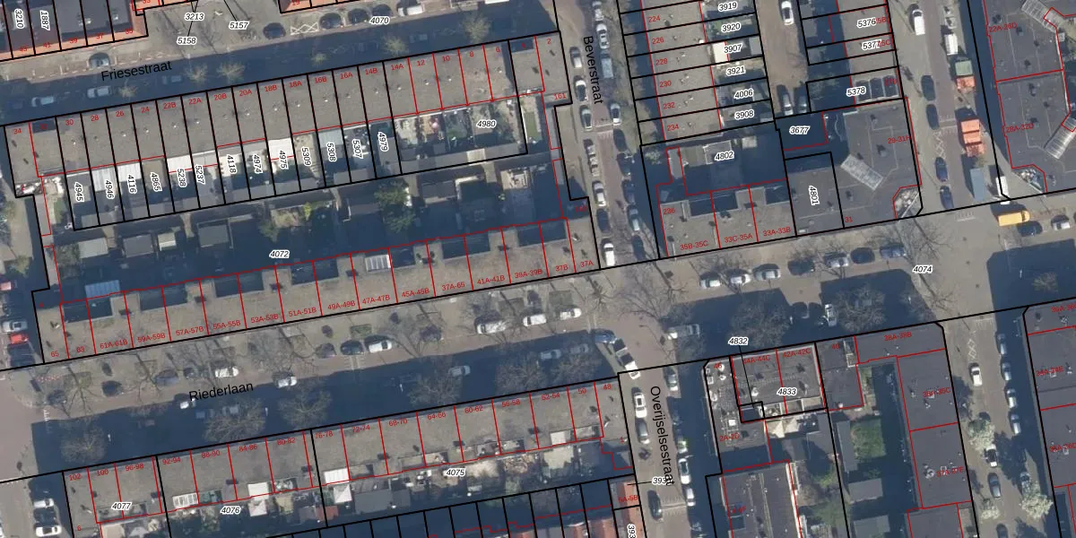 Riederlaan 39-A is gelegen op kadastraal perceel RTD05V4072. Deze kadastrale aanduiding is uniek en wordt gebruikt door het Kadaster om eigendomsrechten en andere zakelijke rechten vast te leggen. Het perceel maakt onderdeel uit van de kadastrale gemeente Rotterdam.
