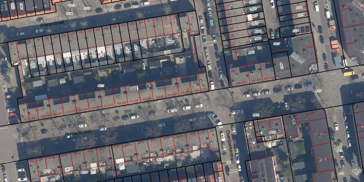 Riederlaan 39-B is gelegen op kadastraal perceel RTD05V4072. Deze kadastrale aanduiding is uniek en wordt gebruikt door het Kadaster om eigendomsrechten en andere zakelijke rechten vast te leggen. Het perceel maakt onderdeel uit van de kadastrale gemeente Rotterdam.