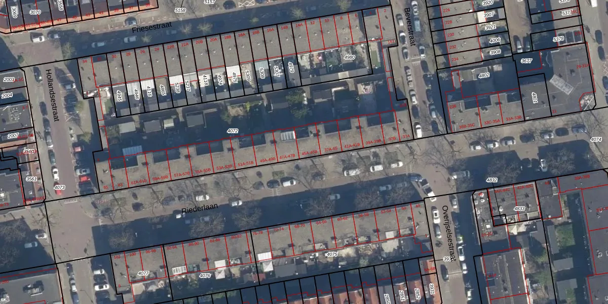Riederlaan 45-B is gelegen op kadastraal perceel RTD05V4072. Deze kadastrale aanduiding is uniek en wordt gebruikt door het Kadaster om eigendomsrechten en andere zakelijke rechten vast te leggen. Het perceel maakt onderdeel uit van de kadastrale gemeente Rotterdam.