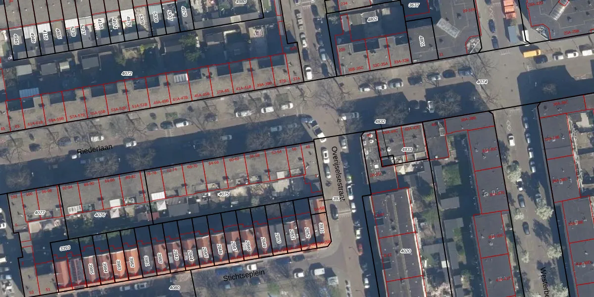 Riederlaan 50 is gelegen op kadastraal perceel RTD05V4075. Deze kadastrale aanduiding is uniek en wordt gebruikt door het Kadaster om eigendomsrechten en andere zakelijke rechten vast te leggen. Het perceel maakt onderdeel uit van de kadastrale gemeente Rotterdam.