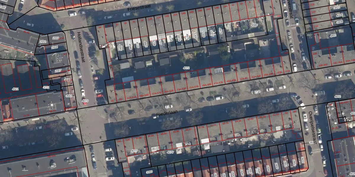 Riederlaan 53-B is gelegen op kadastraal perceel RTD05V4072. Deze kadastrale aanduiding is uniek en wordt gebruikt door het Kadaster om eigendomsrechten en andere zakelijke rechten vast te leggen. Het perceel maakt onderdeel uit van de kadastrale gemeente Rotterdam.