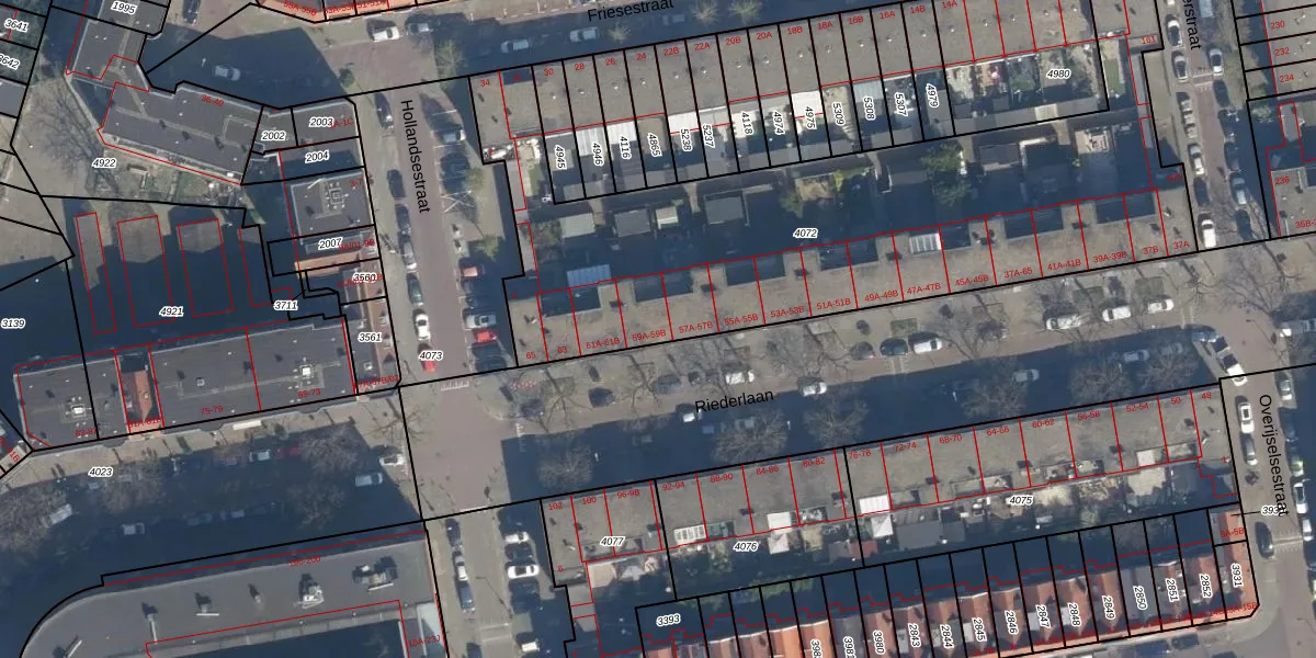 Riederlaan 59-A is gelegen op kadastraal perceel RTD05V4072. Deze kadastrale aanduiding is uniek en wordt gebruikt door het Kadaster om eigendomsrechten en andere zakelijke rechten vast te leggen. Het perceel maakt onderdeel uit van de kadastrale gemeente Rotterdam.
