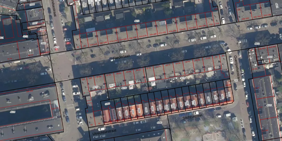 Riederlaan 80 is gelegen op kadastraal perceel RTD05V4076. Deze kadastrale aanduiding is uniek en wordt gebruikt door het Kadaster om eigendomsrechten en andere zakelijke rechten vast te leggen. Het perceel maakt onderdeel uit van de kadastrale gemeente Rotterdam.