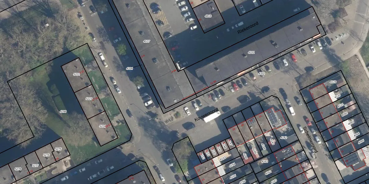 Het perceel waarop Riekeroord 30 staat heeft een oppervlakte van 1036 m². Dit is een zeer groot perceel. De perceeloppervlakte wordt geregistreerd door het Kadaster. Gedetailleerde informatie over de maten van dit perceel kunt u vinden in het rapport Kadastrale kaart met maatvoering van Riekeroord 30.