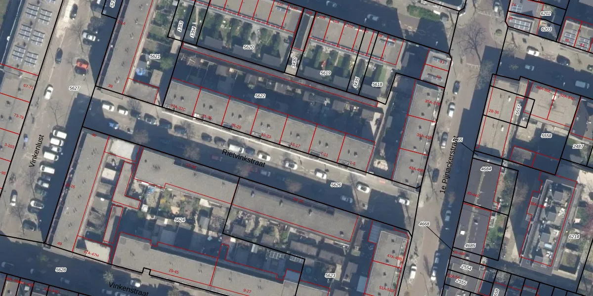 Rietvinkstraat 13 is gelegen op kadastraal perceel RTD07W5622. Deze kadastrale aanduiding is uniek en wordt gebruikt door het Kadaster om eigendomsrechten en andere zakelijke rechten vast te leggen. Het perceel maakt onderdeel uit van de kadastrale gemeente Rotterdam.