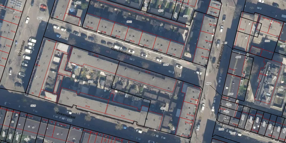 Rietvinkstraat 14 is gelegen op kadastraal perceel RTD07W5623. Deze kadastrale aanduiding is uniek en wordt gebruikt door het Kadaster om eigendomsrechten en andere zakelijke rechten vast te leggen. Het perceel maakt onderdeel uit van de kadastrale gemeente Rotterdam.
