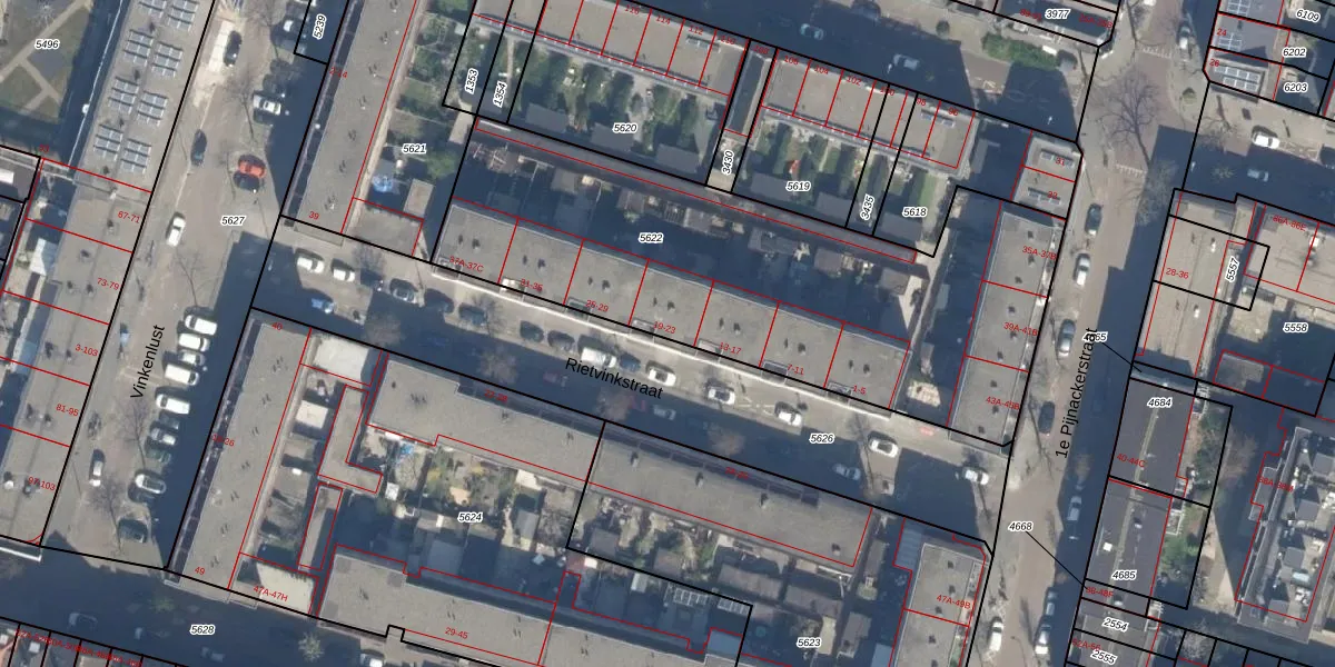 Rietvinkstraat 21 is gelegen op kadastraal perceel RTD07W5622. Deze kadastrale aanduiding is uniek en wordt gebruikt door het Kadaster om eigendomsrechten en andere zakelijke rechten vast te leggen. Het perceel maakt onderdeel uit van de kadastrale gemeente Rotterdam.