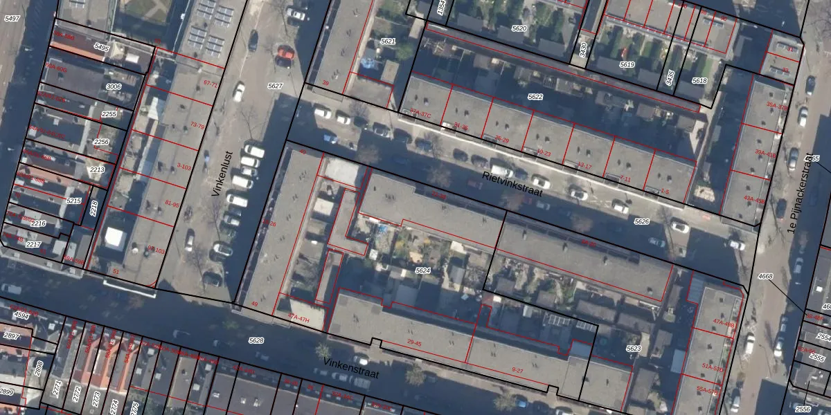 Rietvinkstraat 34 is gelegen op kadastraal perceel RTD07W5624. Deze kadastrale aanduiding is uniek en wordt gebruikt door het Kadaster om eigendomsrechten en andere zakelijke rechten vast te leggen. Het perceel maakt onderdeel uit van de kadastrale gemeente Rotterdam.