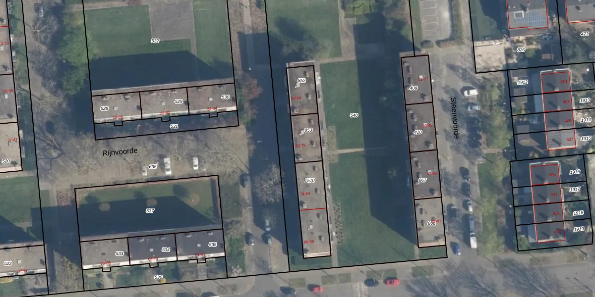 Rijnvoorde 66 is gelegen op kadastraal perceel CLS00K853. Deze kadastrale aanduiding is uniek en wordt gebruikt door het Kadaster om eigendomsrechten en andere zakelijke rechten vast te leggen. Het perceel maakt onderdeel uit van de kadastrale gemeente Charlois.