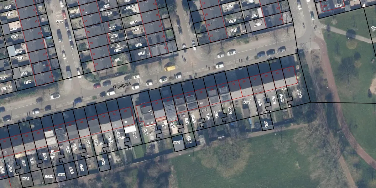 Rijstgras 30 is gelegen op kadastraal perceel HLG03B7472. Deze kadastrale aanduiding is uniek en wordt gebruikt door het Kadaster om eigendomsrechten en andere zakelijke rechten vast te leggen. Het perceel maakt onderdeel uit van de kadastrale gemeente Hillegersberg.