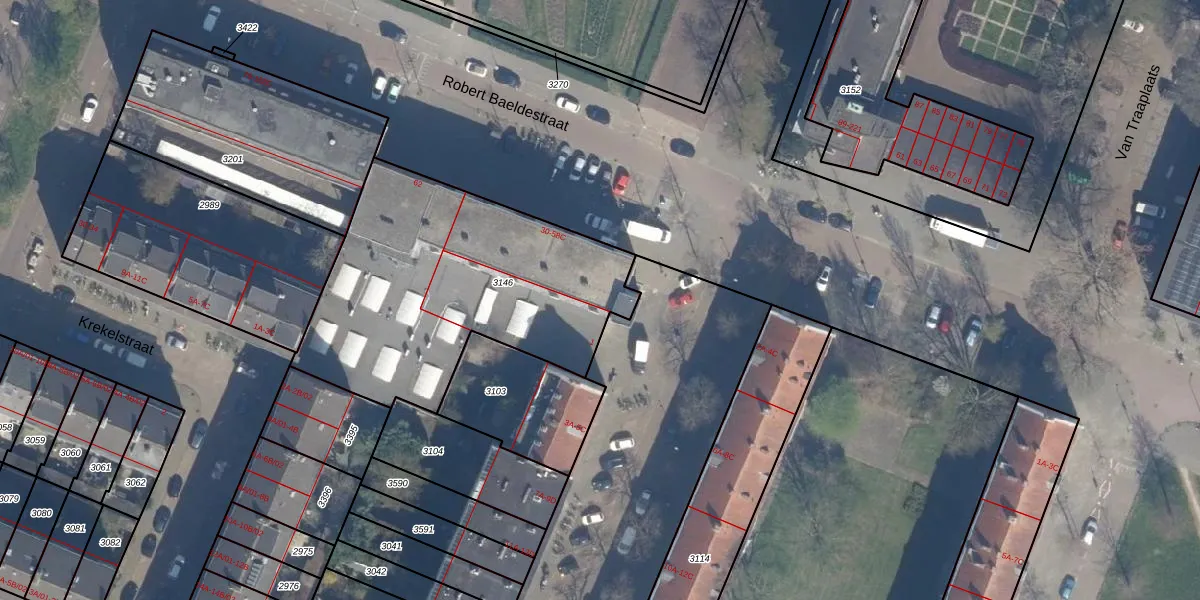 Robert Baeldestraat 56 is gelegen op kadastraal perceel KLG00F3146. Deze kadastrale aanduiding is uniek en wordt gebruikt door het Kadaster om eigendomsrechten en andere zakelijke rechten vast te leggen. Het perceel maakt onderdeel uit van de kadastrale gemeente Kralingen.
