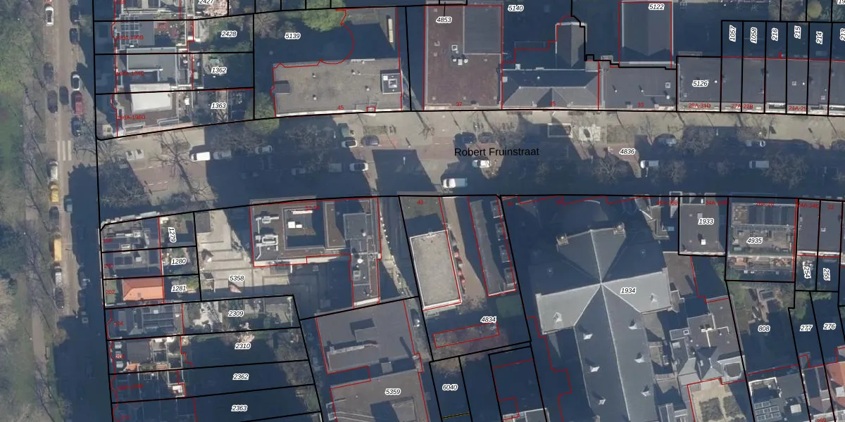 Het perceel waarop Robert Fruinstraat 48 staat heeft een oppervlakte van 885 m². Dit is een groot perceel. De perceeloppervlakte wordt geregistreerd door het Kadaster. Gedetailleerde informatie over de maten van dit perceel kunt u vinden in het rapport Kadastrale kaart met maatvoering van Robert Fruinstraat 48.