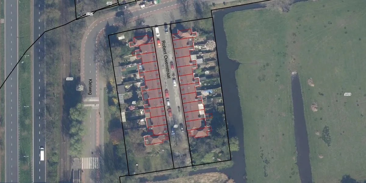 Het perceel waarop Robert Owenstraat 13 staat heeft een oppervlakte van 1760 m². Dit is een zeer groot perceel. De perceeloppervlakte wordt geregistreerd door het Kadaster. Gedetailleerde informatie over de maten van dit perceel kunt u vinden in het rapport Kadastrale kaart met maatvoering van Robert Owenstraat 13.