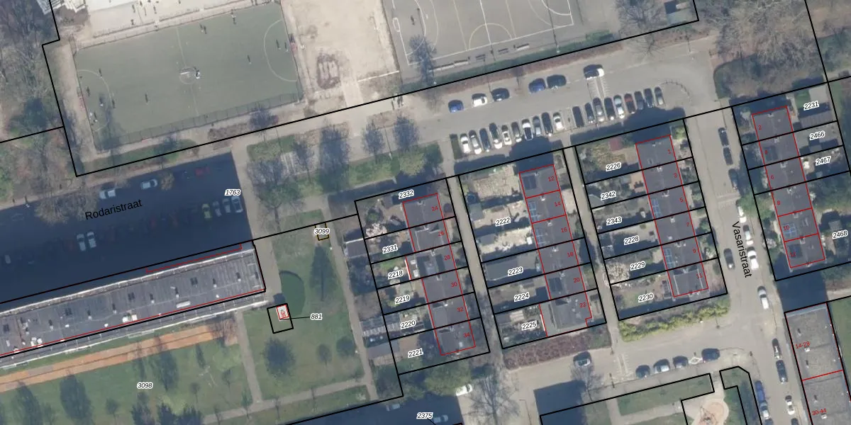 Rodaristraat 24 is gelegen op kadastraal perceel KLG00K2332. Deze kadastrale aanduiding is uniek en wordt gebruikt door het Kadaster om eigendomsrechten en andere zakelijke rechten vast te leggen. Het perceel maakt onderdeel uit van de kadastrale gemeente Kralingen.