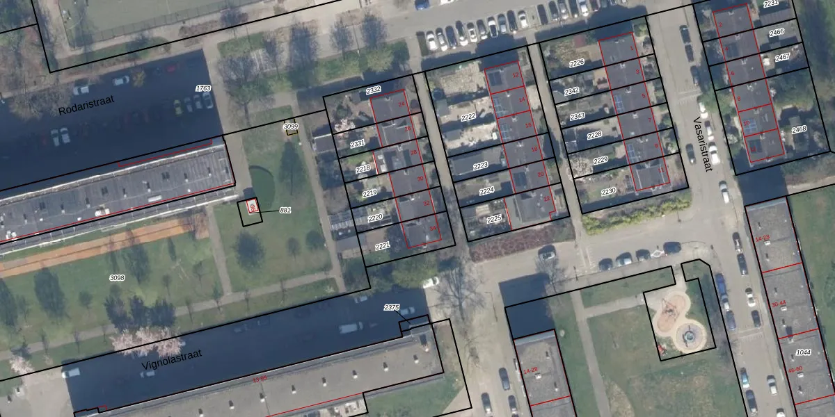 Rodaristraat 32 is gelegen op kadastraal perceel KLG00K2220. Deze kadastrale aanduiding is uniek en wordt gebruikt door het Kadaster om eigendomsrechten en andere zakelijke rechten vast te leggen. Het perceel maakt onderdeel uit van de kadastrale gemeente Kralingen.