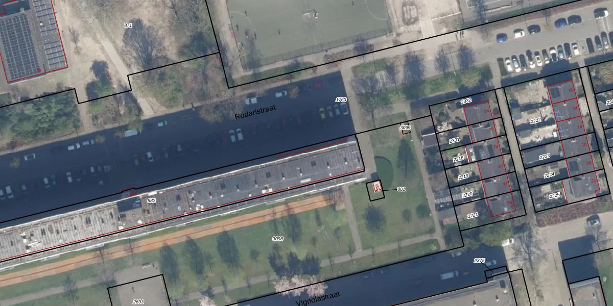 Het perceel waarop Rodaristraat 56 staat heeft een oppervlakte van 1882 m². Dit is een zeer groot perceel. De perceeloppervlakte wordt geregistreerd door het Kadaster. Gedetailleerde informatie over de maten van dit perceel kunt u vinden in het rapport Kadastrale kaart met maatvoering van Rodaristraat 56.