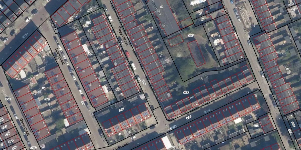 Roggestraat 34 is gelegen op kadastraal perceel CLS00H3716. Deze kadastrale aanduiding is uniek en wordt gebruikt door het Kadaster om eigendomsrechten en andere zakelijke rechten vast te leggen. Het perceel maakt onderdeel uit van de kadastrale gemeente Charlois.