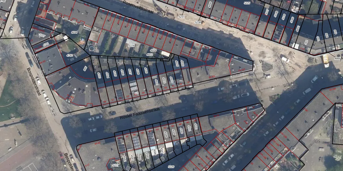 Rosier Faassenstraat 41 is gelegen op kadastraal perceel DHV00H4603. Deze kadastrale aanduiding is uniek en wordt gebruikt door het Kadaster om eigendomsrechten en andere zakelijke rechten vast te leggen. Het perceel maakt onderdeel uit van de kadastrale gemeente Delfshaven.
