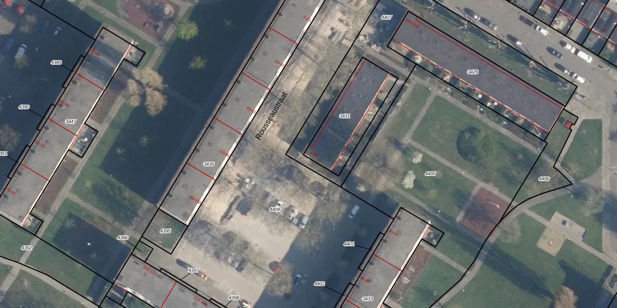 Het perceel waarop Rousseaustraat 26 staat heeft een oppervlakte van 498 m². Dit is een groot perceel. De perceeloppervlakte wordt geregistreerd door het Kadaster. Gedetailleerde informatie over de maten van dit perceel kunt u vinden in het rapport Kadastrale kaart met maatvoering van Rousseaustraat 26.